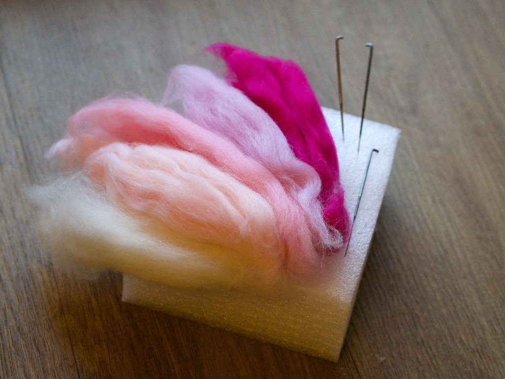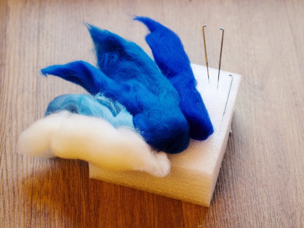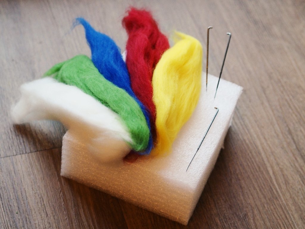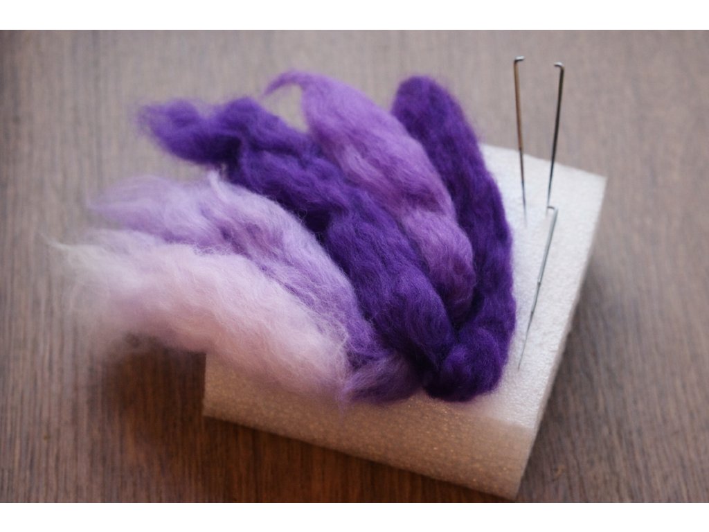 Sada na jehlové plstění pro začátečníky. Obsahuje pěnovou podložku, 3 jehly vel. L a 5 barev česané vlny pro první tvoření.
